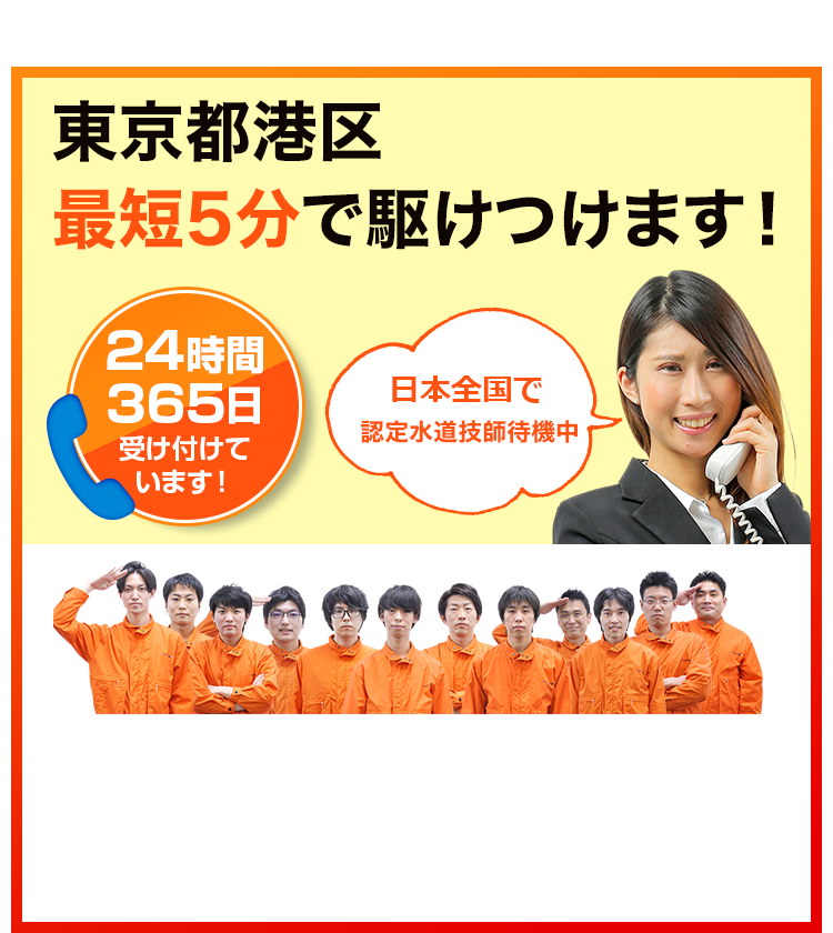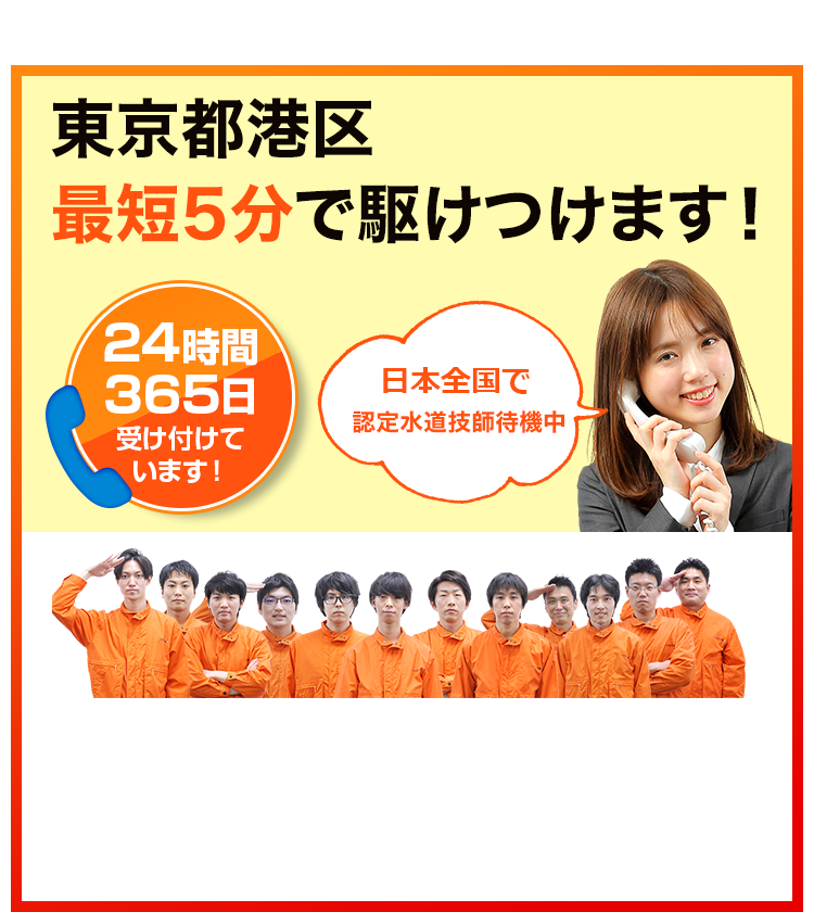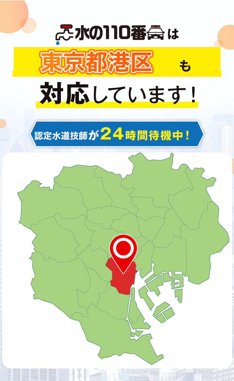 港区のトイレつまり・水漏れ、六本木から赤坂、青山まで最短5分で急行。港区全域をカバーする24時間365日の迅速対応で、いつでも安心のサービスを。